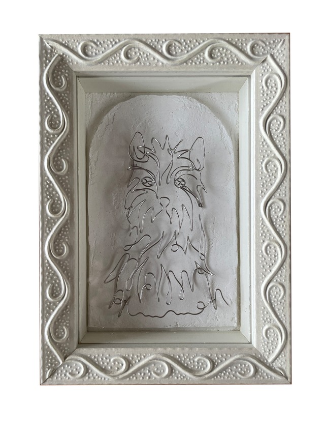 1本の針金を一筆書きの要領で描くワイヤードローイング作品で、「線」である二次元の作品が多次元に展開していくワイヤーアートです。 本作は「存在のフォルム」というシリーズ作品の一つです。命の姿を映し出すべく、美しいと感じるフォルムだけを抜き出し、作品として仕上げています。女性の顔を中心にその眼差しを描き、タイトルを「その先」としました。どこか遠くを見る眼差を感じます。 590×540mm Wire, Wood panel, Mortar /2022 ※証明書付 ※当ショップは作家自身が運営しています。展覧会中や長期出張中などは、配送が遅れる場合があります。あらかじめご了承ください。 It is a wire drawing work, in which a single wire is drawn in the manner of a single stroke. It is a wire art in which a two-dimensional work, a "line," develops into a multidimensional work. This work is one of a series of works called "Forms of Existence. In order to reflect the form of life, I extract only the forms that I find beautiful and finish them as a work of art. I depicted a woman's face and her gaze, and titled the work "Beyond. The work is titled "Beyond." The viewer can feel the difference of eyes looking somewhere far away. 590×540mm Wire, Wood panel, Mortar /2022 With certificate This store is run by the artist himself. Delivery may be delayed during exhibitions or long business trips. Please understand this in advance.