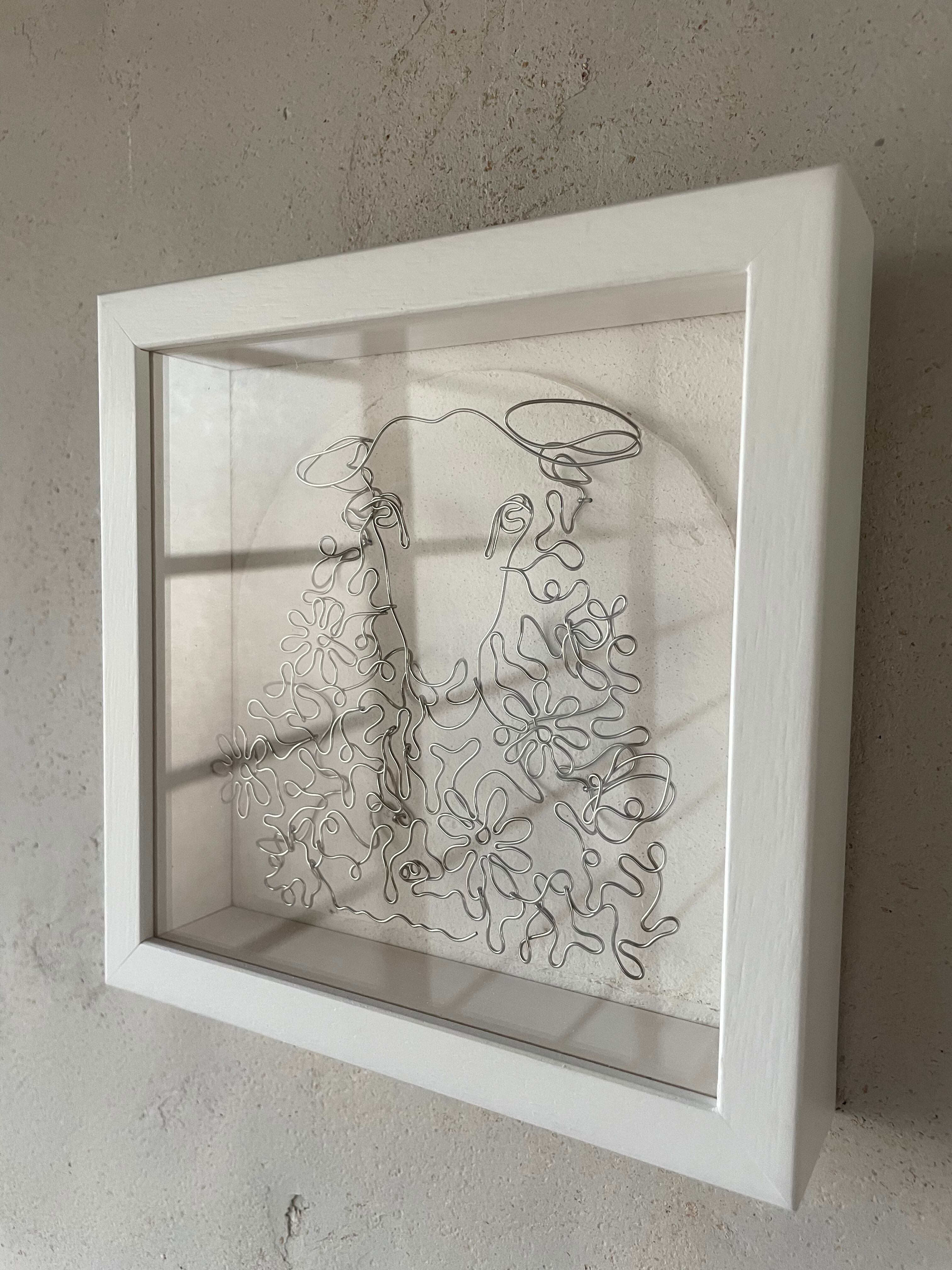 1本の針金を一筆書きの要領で描くワイヤードローイング作品で、「線」である二次元の作品が多次元に展開していくワイヤーアートです。