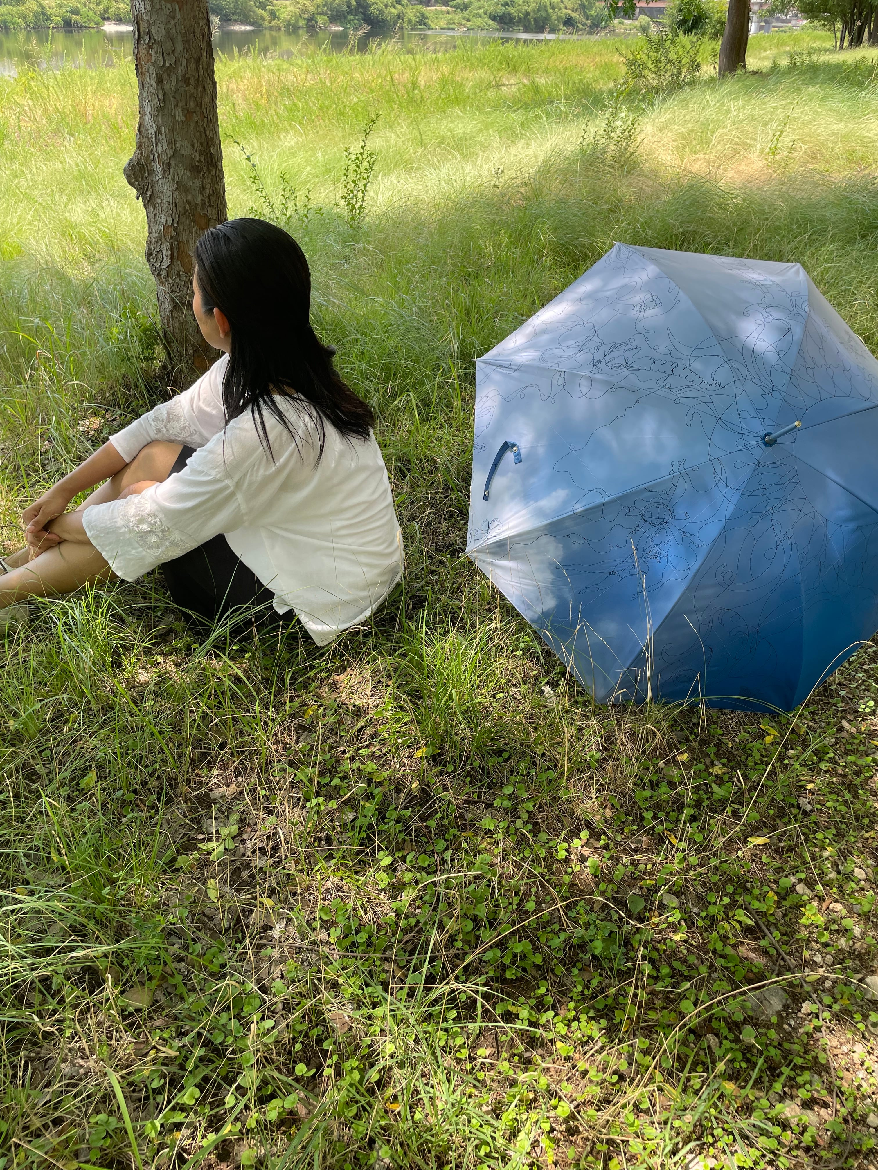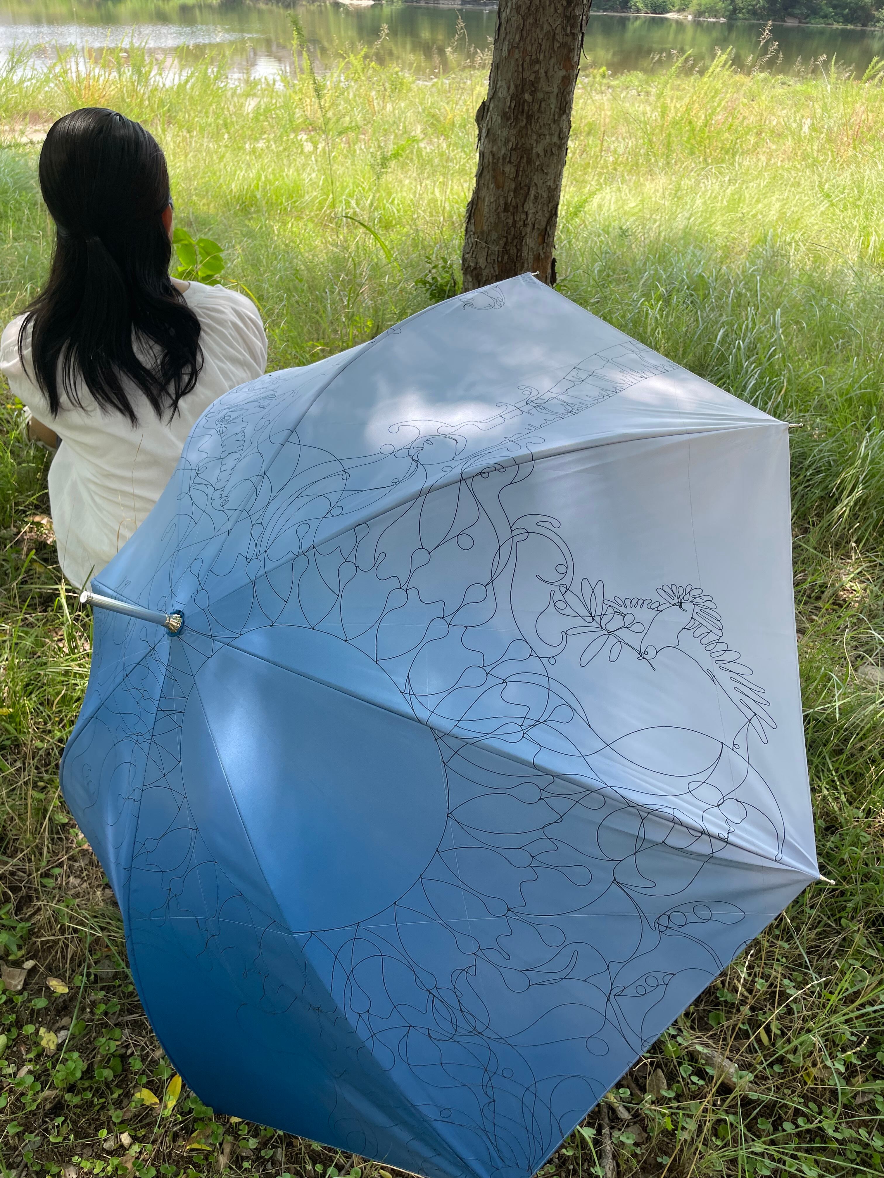2016年に開催した展覧会「絵空事」のビジュアルが傘になりました。大勢の方が足を運んでご覧いただいた、青空を取り込んだワイヤーアートがあなたの手元に!みんな絵空事をかざして、夢を叶えてください。