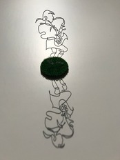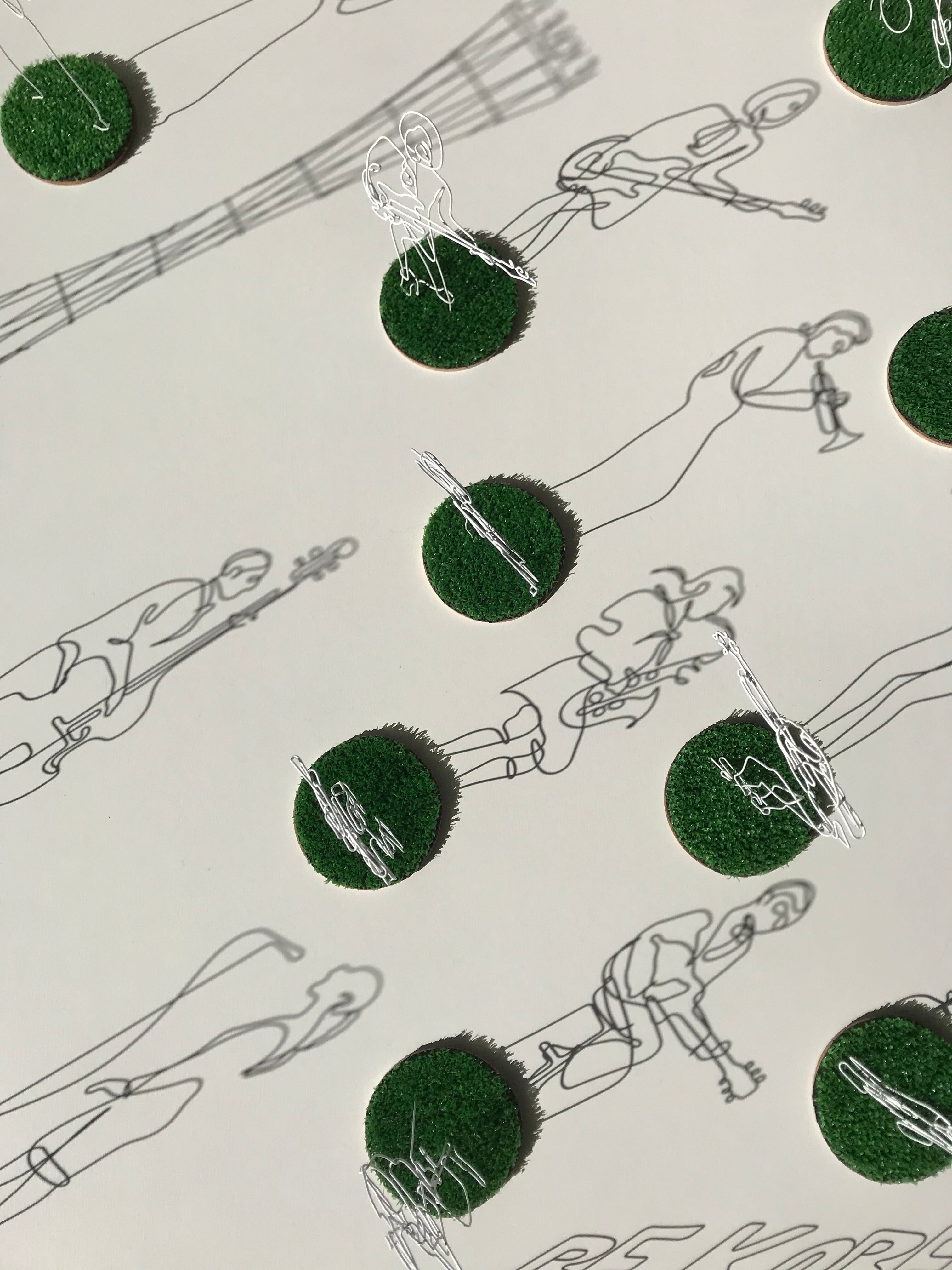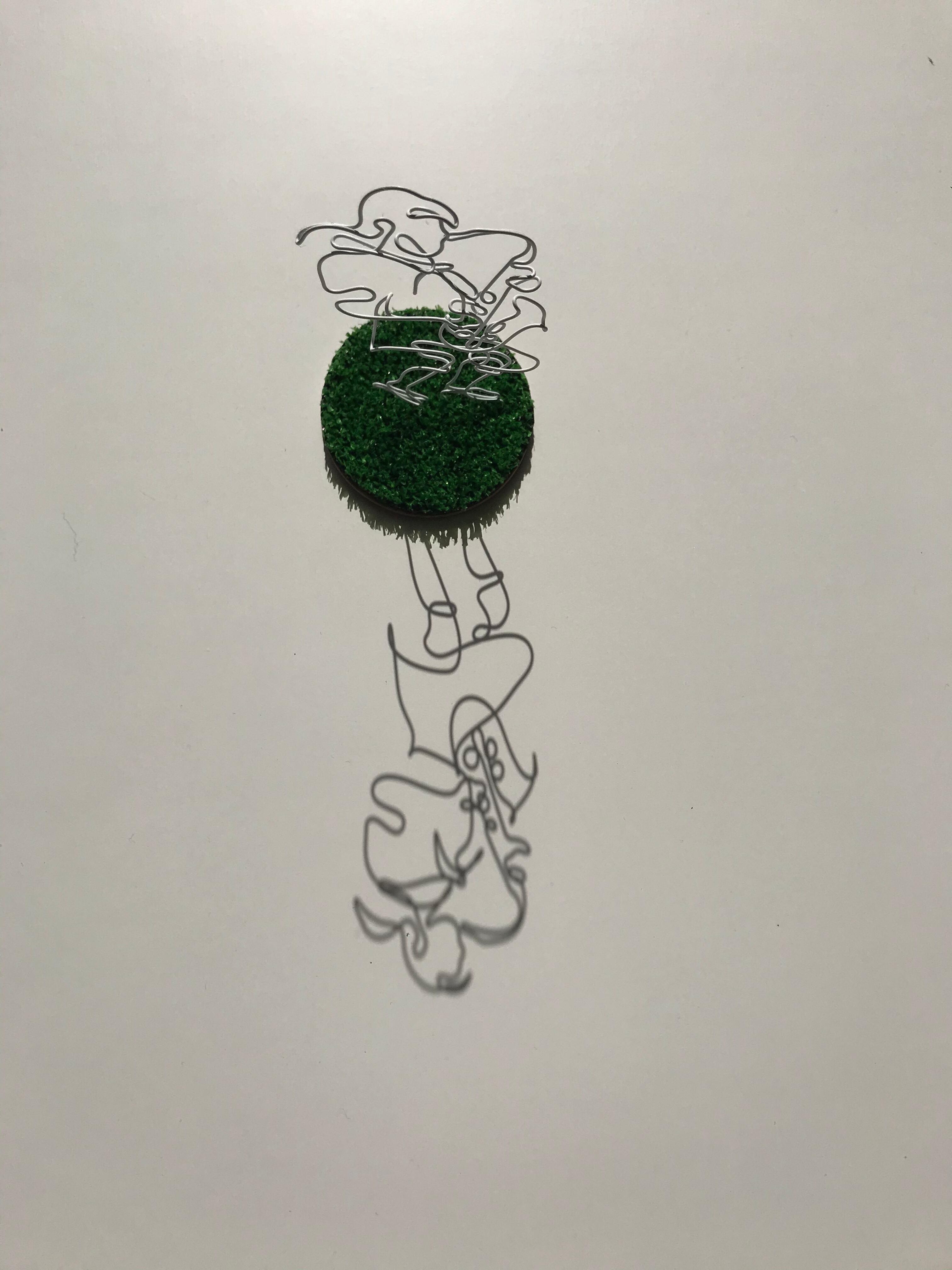 一本の針金を一筆で創作した、自立する小作品です。木板に人工芝を貼り付け、ワイヤードローイングを刺し付けています。ワイヤーは樹脂塗料で着色。日頃見かける人物をモチーフに、日常のアクセントになるアート作品です。