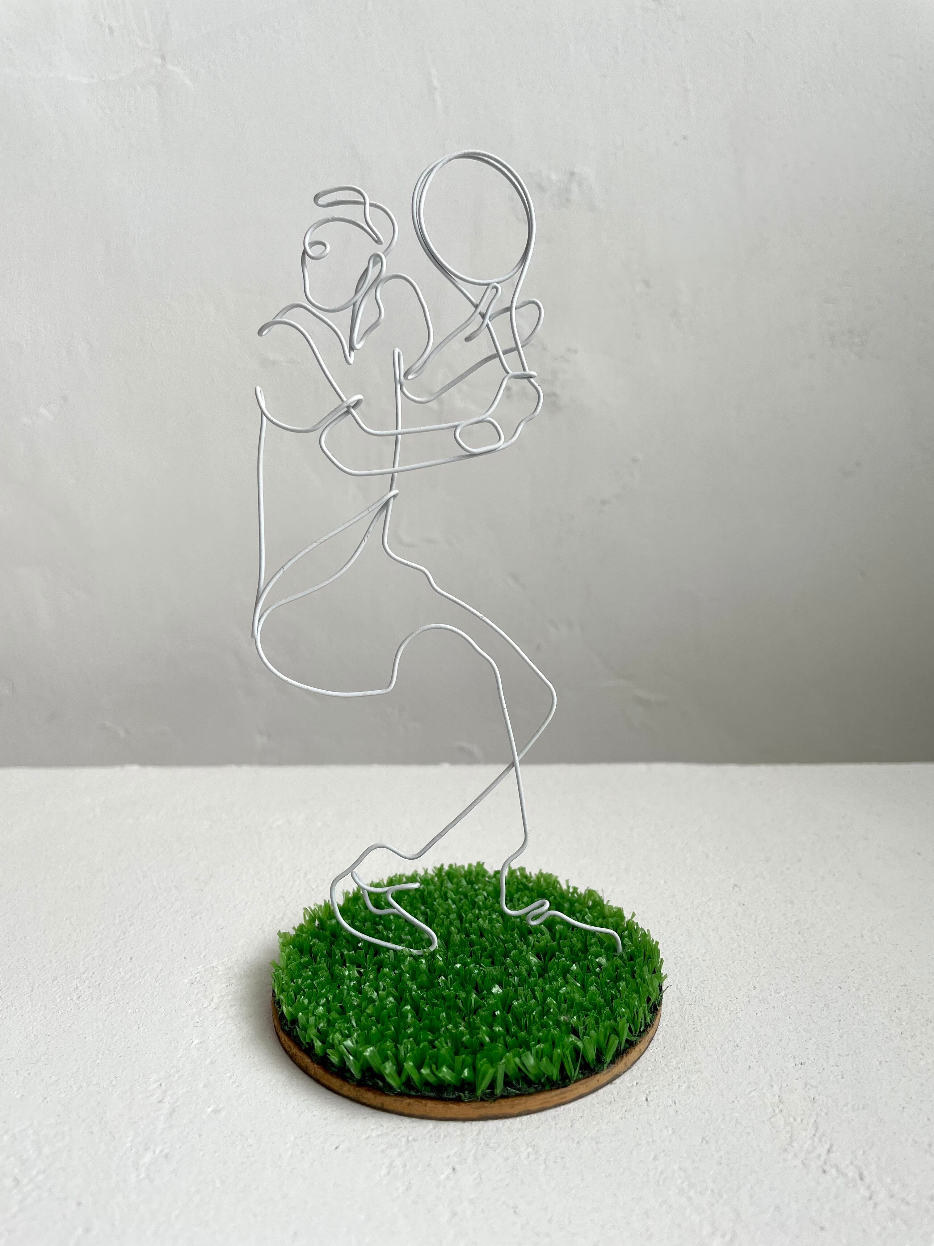 一本の針金を一筆で創作した、自立する小作品です。木板に人工芝を貼り付け、ワイヤードローイングを刺し付けています。ワイヤーは樹脂塗料で着色。日頃見かける人物をモチーフに、日常のアクセントになるアート作品です。