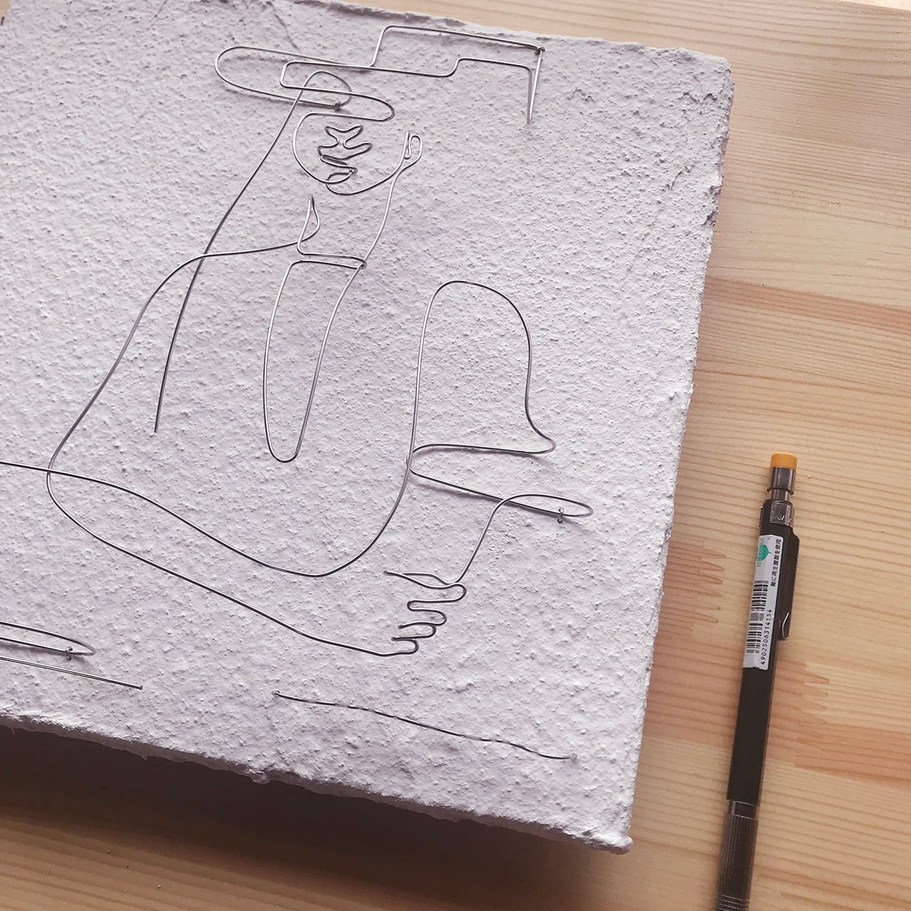 1本のワイヤーを一筆書きの要領で空中に人を描くことで、「線」である二次元の作品が多次元に展開していくワイヤーアート。本シリーズでは、インターネットの普及でCLOUDに情報が共有されていく現代に着想し、「線」をデータ通信のコードに見立てて作品とした。人を模ったコードにあなたは何を見るのだろう。